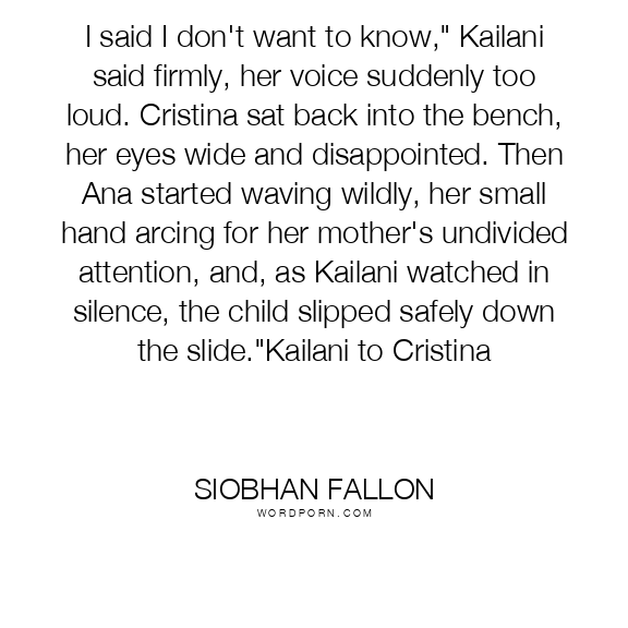 I said I don't want to know," Kailani said firmly, her voice suddenly too loud. Cristina sat back into the bench, her eyes wide and disappointed. Then Ana started waving wildly, her small hand arcing for her mother's undivided attention, and, as Kailani watched in silence, the child slipped safely down the slide."Kailani to Cristina