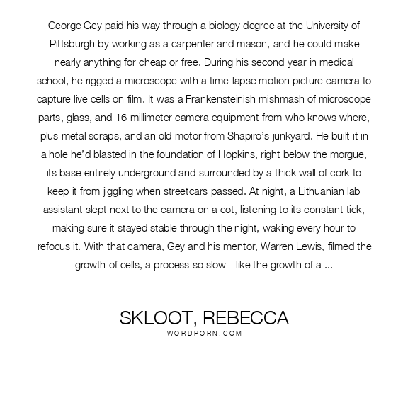 George Gey paid his way through a biology degree at the University of Pittsburgh by working as a carpenter and mason, and he could make nearly anything for cheap or free. During his second year in medical school, he rigged a microscope with a time-lapse motion picture camera to capture live cells on film. It was a Frankensteinish mishmash of microscope parts, glass, and 16-millimeter camera equipment from who knows where, plus metal scraps, and an old motor from Shapiro’s junkyard. He built it in a hole he’d blasted in the foundation of Hopkins, right below the morgue, its base entirely underground and surrounded by a thick wall of cork to keep it from jiggling when streetcars passed. At night, a Lithuanian lab assistant slept next to the camera on a cot, listening to its constant tick, making sure it stayed stable through the night, waking every hour to refocus it. With that camera, Gey and his mentor, Warren Lewis, filmed the growth of cells, a process so slow - like the growth of a flower - the naked eye couldn’t see it. They played the film at high speed so they could watch cell division on the screen in one smooth motion, like a story unfolding in a flip book
