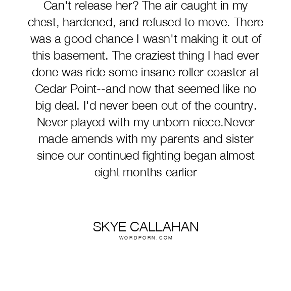 Can't release her? The air caught in my chest, hardened, and refused to move. There was a good chance I wasn't making it out of this basement. The craziest thing I had ever done was ride some insane roller coaster at Cedar Point--and now that seemed like no big deal. I'd never been out of the country. Never played with my unborn niece.Never made amends with my parents and sister since our continued fighting began almost eight months earlier