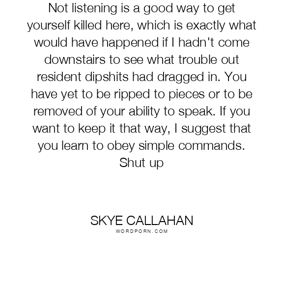 Not listening is a good way to get yourself killed here, which is exactly what would have happened if I hadn't come downstairs to see what trouble out resident dipshits had dragged in. You have yet to be ripped to pieces or to be removed of your ability to speak. If you want to keep it that way, I suggest that you learn to obey simple commands. Shut up