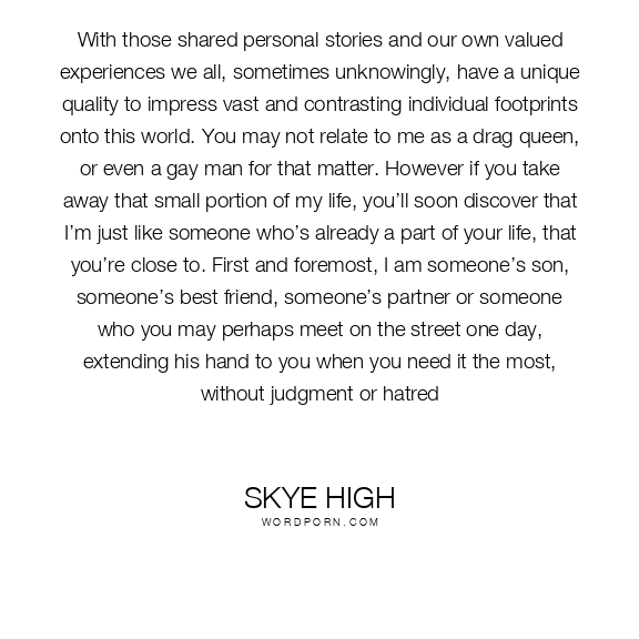 With those shared personal stories and our own valued experiences we all, sometimes unknowingly, have a unique quality to impress vast and contrasting individual footprints onto this world. You may not relate to me as a drag queen, or even a gay man for that matter. However if you take away that small portion of my life, you’ll soon discover that I’m just like someone who’s already a part of your life, that you’re close to. First and foremost, I am someone’s son, someone’s best friend, someone’s partner or someone who you may perhaps meet on the street one day, extending his hand to you when you need it the most, without judgment or hatred