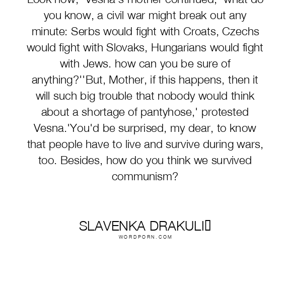 Look now,' Vesna's mother continued, 'what do you know, a civil war might break out any minute: Serbs would fight with Croats, Czechs would fight with Slovaks, Hungarians would fight with Jews. how can you be sure of anything?''But, Mother, if this happens, then it will such big trouble that nobody would think about a shortage of pantyhose,' protested Vesna.'You'd be surprised, my dear, to know that people have to live and survive during wars, too. Besides, how do you think we survived communism?