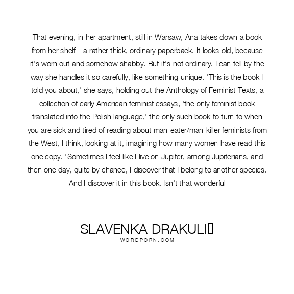 That evening, in her apartment, still in Warsaw, Ana takes down a book from her shelf – a rather thick, ordinary paperback. It looks old, because it's worn out and somehow shabby. But it's not ordinary. I can tell by the way she handles it so carefully, like something unique. 'This is the book I told you about,' she says, holding out the Anthology of Feminist Texts, a collection of early American feminist essays, 'the only feminist book translated into the Polish language,' the only such book to turn to when you are sick and tired of reading about man-eater/man-killer feminists from the West, I think, looking at it, imagining how many women have read this one copy. 'Sometimes I feel like I live on Jupiter, among Jupiterians, and then one day, quite by chance, I discover that I belong to another species. And I discover it in this book. Isn't that wonderful
