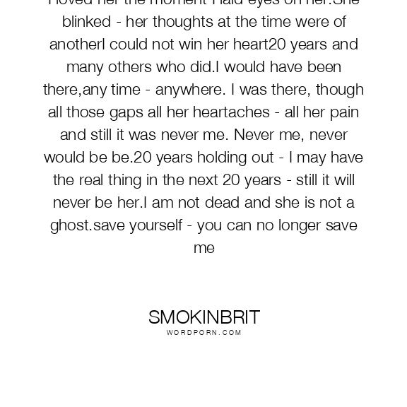 I loved her the moment I laid eyes on her.She blinked - her thoughts at the time were of anotherI could not win her heart20 years and many others who did.I would have been there,any time - anywhere. I was there, though all those gaps all her heartaches - all her pain and still it was never me. Never me, never would be be.20 years holding out - I may have the real thing in the next 20 years - still it will never be her.I am not dead and she is not a ghost.save yourself - you can no longer save me