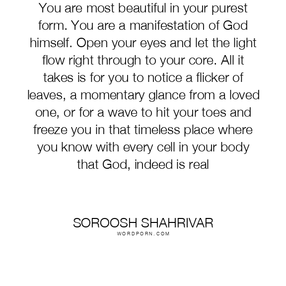 You are most beautiful in your purest form. You are a manifestation of God himself. Open your eyes and let the light flow right through to your core. All it takes is for you to notice a flicker of leaves, a momentary glance from a loved one, or for a wave to hit your toes and freeze you in that timeless place where you know with every cell in your body that God, indeed is real