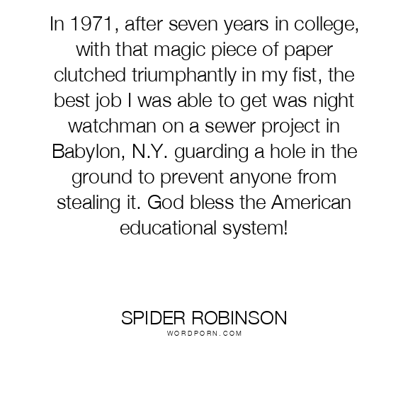 In 1971, after seven years in college, with that magic piece of paper clutched triumphantly in my fist, the best job I was able to get was night watchman on a sewer project in Babylon, N.Y. guarding a hole in the ground to prevent anyone from stealing it. God bless the American educational system!