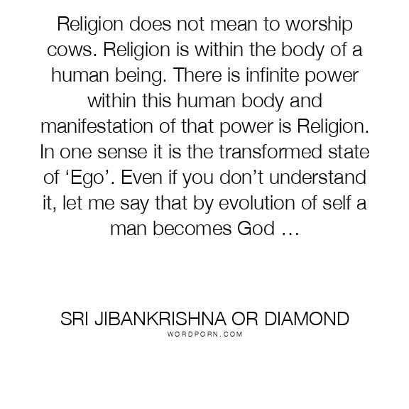 Religion does not mean to worship cows. Religion is within the body of a human being. There is infinite power within this human body and manifestation of that power is Religion. In one sense it is the transformed state of ‘Ego’. Even if you don’t understand it, let me say that by evolution of self a man becomes God …