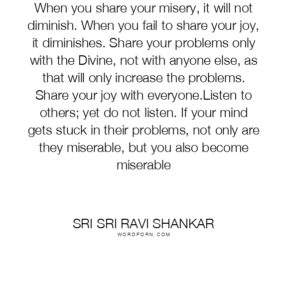 When you share your misery, it will not diminish. When you fail to share your joy, it diminishes. Share your problems only with the Divine, not with anyone else, as that will only increase the problems. Share your joy with everyone.Listen to others; yet do not listen. If your mind gets stuck in their problems, not only are they miserable, but you also become miserable