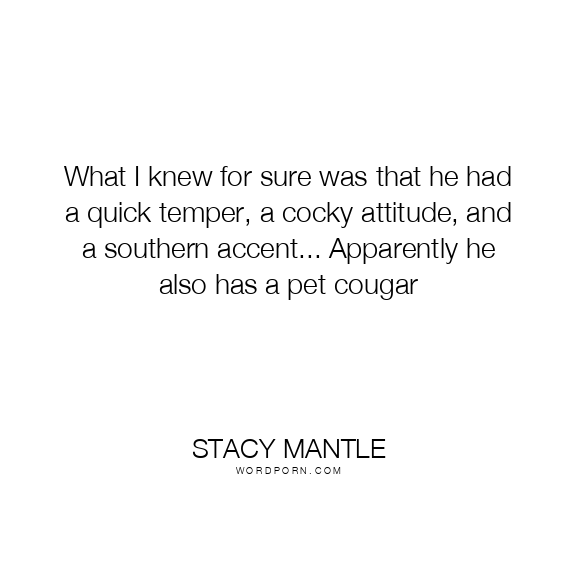Copy Image What I knew for sure was that he had a quick temper, a cocky attitude, and a southern accent... Apparently he also has a pet cougar Moms Typewriter A A SAVE THIS IMAGE