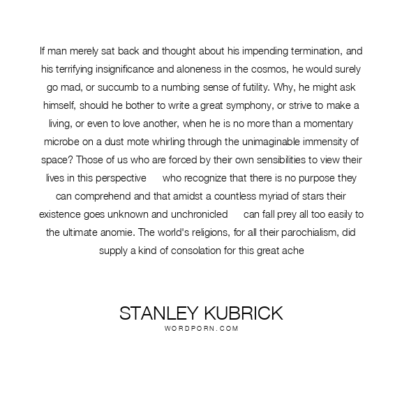 If man merely sat back and thought about his impending termination, and his terrifying insignificance and aloneness in the cosmos, he would surely go mad, or succumb to a numbing sense of futility. Why, he might ask himself, should he bother to write a great symphony, or strive to make a living, or even to love another, when he is no more than a momentary microbe on a dust mote whirling through the unimaginable immensity of space? Those of us who are forced by their own sensibilities to view their lives in this perspective — who recognize that there is no purpose they can comprehend and that amidst a countless myriad of stars their existence goes unknown and unchronicled — can fall prey all too easily to the ultimate anomie. The world's religions, for all their parochialism, did supply a kind of consolation for this great ache