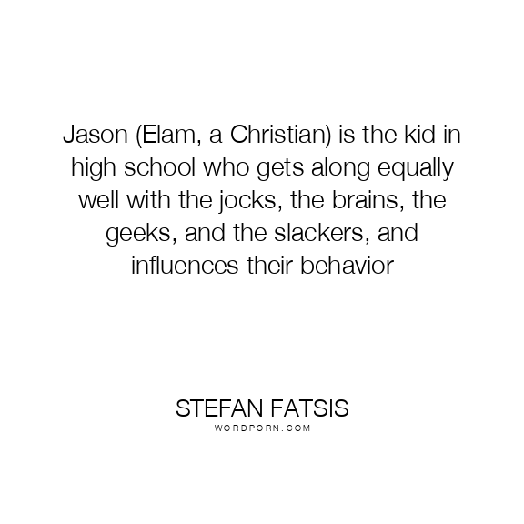 Copy Image Jason (Elam, a Christian) is the kid in high school who gets along equally well with the jocks, the brains, the geeks, and the slackers, and influences their behavior Moms Typewriter A A SAVE THIS IMAGE