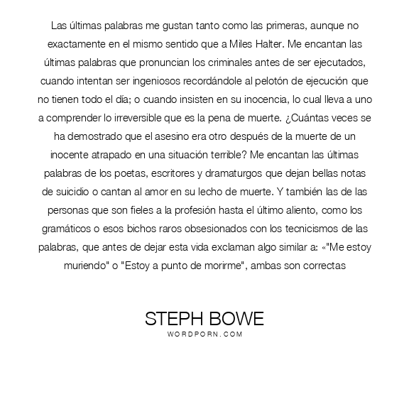 Las últimas palabras me gustan tanto como las primeras, aunque no exactamente en el mismo sentido que a Miles Halter. Me encantan las últimas palabras que pronuncian los criminales antes de ser ejecutados, cuando intentan ser ingeniosos recordándole al pelotón de ejecución que no tienen todo el día; o cuando insisten en su inocencia, lo cual lleva a uno a comprender lo irreversible que es la pena de muerte. ¿Cuántas veces se ha demostrado que el asesino era otro después de la muerte de un inocente atrapado en una situación terrible? Me encantan las últimas palabras de los poetas, escritores y dramaturgos que dejan bellas notas de suicidio o cantan al amor en su lecho de muerte. Y también las de las personas que son fieles a la profesión hasta el último aliento, como los gramáticos o esos bichos raros obsesionados con los tecnicismos de las palabras, que antes de dejar esta vida exclaman algo similar a: «"Me estoy muriendo" o "Estoy a punto de morirme", ambas son correctas