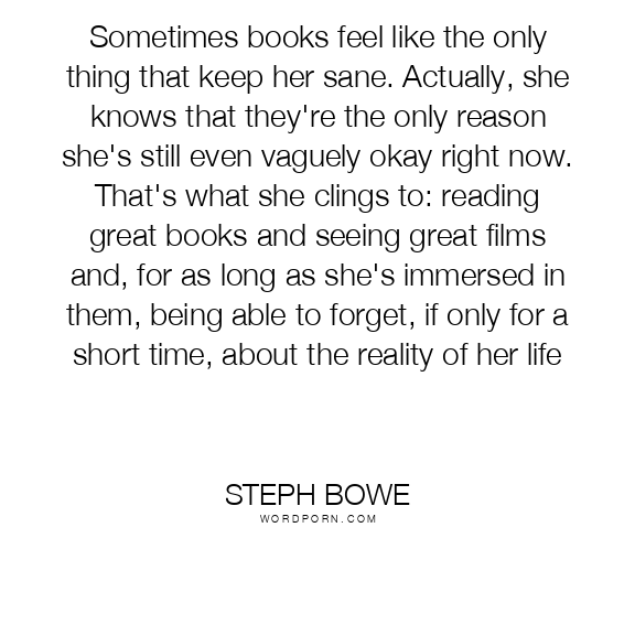 Sometimes books feel like the only thing that keep her sane. Actually, she knows that they're the only reason she's still even vaguely okay right now. That's what she clings to: reading great books and seeing great films and, for as long as she's immersed in them, being able to forget, if only for a short time, about the reality of her life