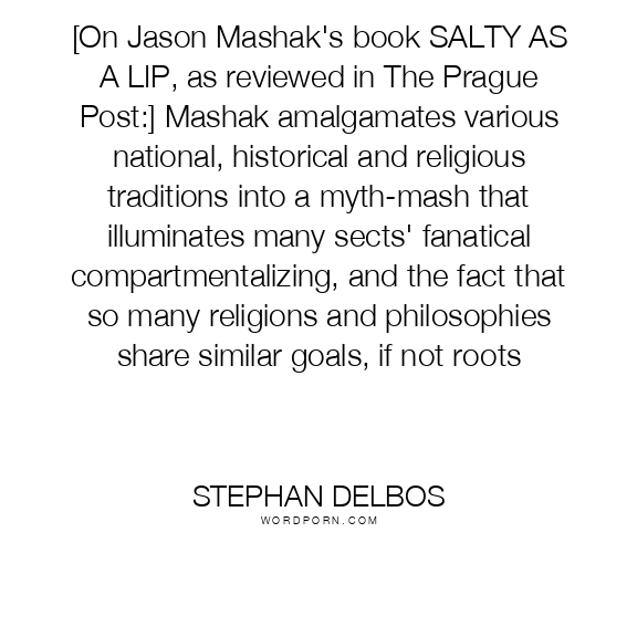 [On Jason Mashak's book SALTY AS A LIP, as reviewed in The Prague Post:] Mashak amalgamates various national, historical and religious traditions into a myth-mash that illuminates many sects' fanatical compartmentalizing, and the fact that so many religions and philosophies share similar goals, if not roots