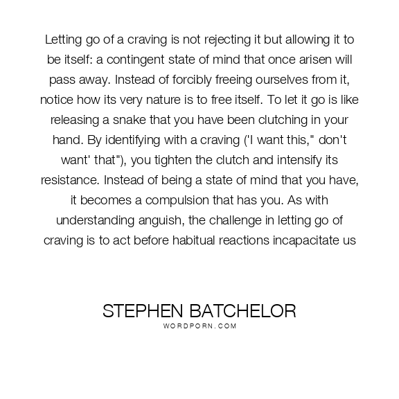 Letting go of a craving is not rejecting it but allowing it to be itself: a contingent state of mind that once arisen will pass away. Instead of forcibly freeing ourselves from it, notice how its very nature is to free itself. To let it go is like releasing a snake that you have been clutching in your hand. By identifying with a craving ('I want this," don't want' that"), you tighten the clutch and intensify its resistance. Instead of being a state of mind that you have, it becomes a compulsion that has you. As with understanding anguish, the challenge in letting go of craving is to act before habitual reactions incapacitate us