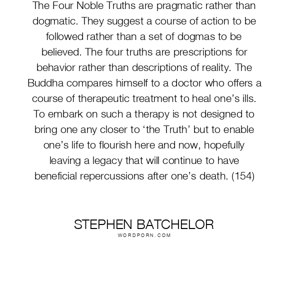 The Four Noble Truths are pragmatic rather than dogmatic. They suggest a course of action to be followed rather than a set of dogmas to be believed. The four truths are prescriptions for behavior rather than descriptions of reality. The Buddha compares himself to a doctor who offers a course of therapeutic treatment to heal one’s ills. To embark on such a therapy is not designed to bring one any closer to ‘the Truth’ but to enable one’s life to flourish here and now, hopefully leaving a legacy that will continue to have beneficial repercussions after one’s death. (154)
