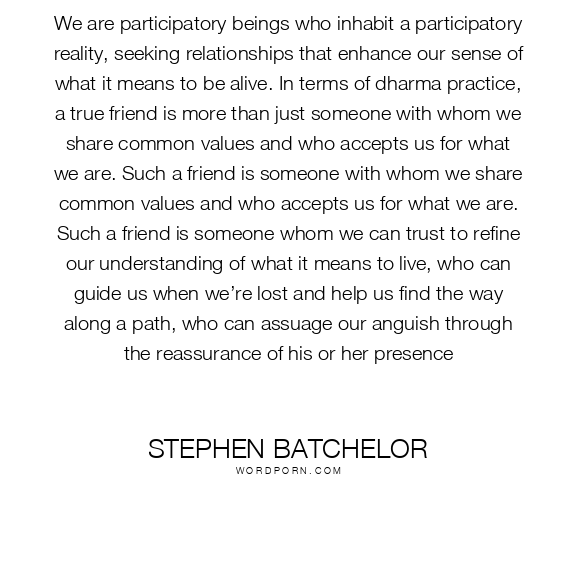 We are participatory beings who inhabit a participatory reality, seeking relationships that enhance our sense of what it means to be alive. In terms of dharma practice, a true friend is more than just someone with whom we share common values and who accepts us for what we are. Such a friend is someone with whom we share common values and who accepts us for what we are. Such a friend is someone whom we can trust to refine our understanding of what it means to live, who can guide us when we’re lost and help us find the way along a path, who can assuage our anguish through the reassurance of his or her presence