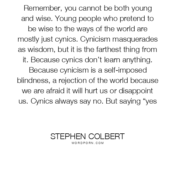 Remember, you cannot be both young and wise. Young people who pretend to be wise to the ways of the world are mostly just cynics. Cynicism masquerades as wisdom, but it is the farthest thing from it. Because cynics don’t learn anything. Because cynicism is a self-imposed blindness, a rejection of the world because we are afraid it will hurt us or disappoint us. Cynics always say no. But saying “yes