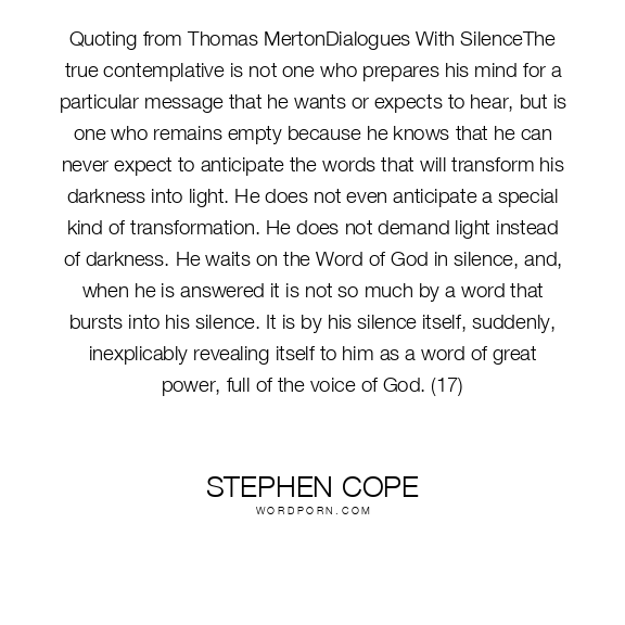 Quoting from Thomas MertonDialogues With SilenceThe true contemplative is not one who prepares his mind for a particular message that he wants or expects to hear, but is one who remains empty because he knows that he can never expect to anticipate the words that will transform his darkness into light. He does not even anticipate a special kind of transformation. He does not demand light instead of darkness. He waits on the Word of God in silence, and, when he is answered it is not so much by a word that bursts into his silence. It is by his silence itself, suddenly, inexplicably revealing itself to him as a word of great power, full of the voice of God. (17)