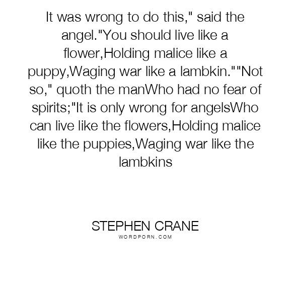 It was wrong to do this," said the angel."You should live like a flower,Holding malice like a puppy,Waging war like a lambkin.""Not so," quoth the manWho had no fear of spirits;"It is only wrong for angelsWho can live like the flowers,Holding malice like the puppies,Waging war like the lambkins