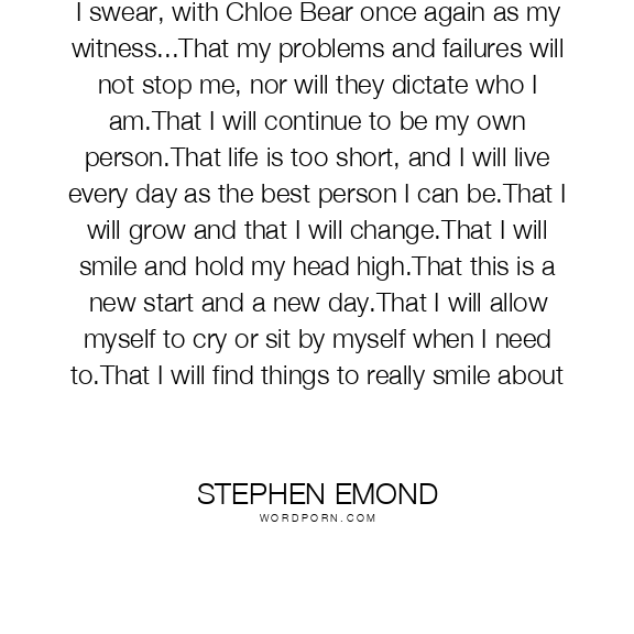 I swear, with Chloe Bear once again as my witness...That my problems and failures will not stop me, nor will they dictate who I am.That I will continue to be my own person.That life is too short, and I will live every day as the best person I can be.That I will grow and that I will change.That I will smile and hold my head high.That this is a new start and a new day.That I will allow myself to cry or sit by myself when I need to.That I will find things to really smile about