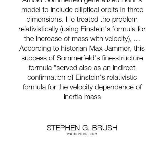 Arnold Sommerfeld generalized Bohr's model to include elliptical orbits in three dimensions. He treated the problem relativistically (using Einstein's formula for the increase of mass with velocity), ... According to historian Max Jammer, this success of Sommerfeld's fine-structure formula "served also as an indirect confirmation of Einstein's relativistic formula for the velocity dependence of inertia mass