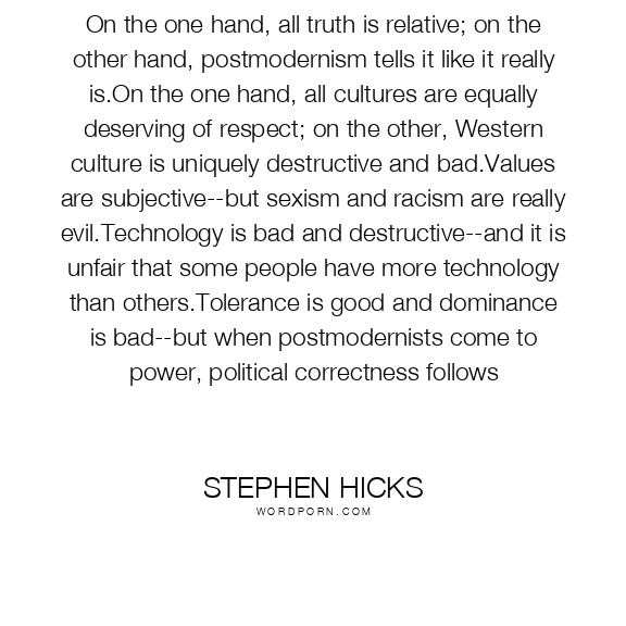 On the one hand, all truth is relative; on the other hand, postmodernism tells it like it really is.On the one hand, all cultures are equally deserving of respect; on the other, Western culture is uniquely destructive and bad.Values are subjective--but sexism and racism are really evil.Technology is bad and destructive--and it is unfair that some people have more technology than others.Tolerance is good and dominance is bad--but when postmodernists come to power, political correctness follows