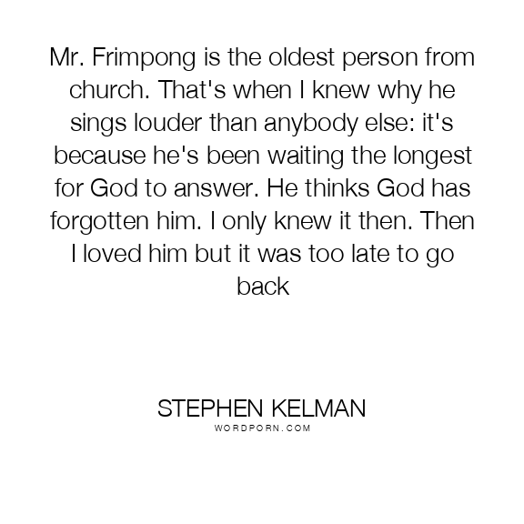 Mr. Frimpong is the oldest person from church. That's when I knew why he sings louder than anybody else: it's because he's been waiting the longest for God to answer. He thinks God has forgotten him. I only knew it then. Then I loved him but it was too late to go back
