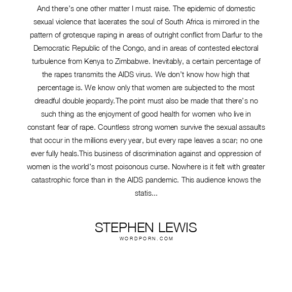 And there’s one other matter I must raise. The epidemic of domestic sexual violence that lacerates the soul of South Africa is mirrored in the pattern of grotesque raping in areas of outright conflict from Darfur to the Democratic Republic of the Congo, and in areas of contested electoral turbulence from Kenya to Zimbabwe. Inevitably, a certain percentage of the rapes transmits the AIDS virus. We don’t know how high that percentage is. We know only that women are subjected to the most dreadful double jeopardy.The point must also be made that there’s no such thing as the enjoyment of good health for women who live in constant fear of rape. Countless strong women survive the sexual assaults that occur in the millions every year, but every rape leaves a scar; no one ever fully heals.This business of discrimination against and oppression of women is the world’s most poisonous curse. Nowhere is it felt with greater catastrophic force than in the AIDS pandemic. This audience knows the statistics full well: you’ve chronicled them, you’ve measured them, the epidemiologists amongst you have disaggregated them. What has to happen, with one unified voice, is that the scientific community tells the political community that it must understand one incontrovertible fact of health: bringing an end to sexual violence is a vital component in bringing an end to AIDS.The brave groups of women who dare to speak up on the ground, in country after country, should not have to wage this fight in despairing and lonely isolation. They should hear the voices of scientific thunder. You understand the connections between violence against women and vulnerability to the virus. No one can challenge your understanding. Use it, I beg you, use it