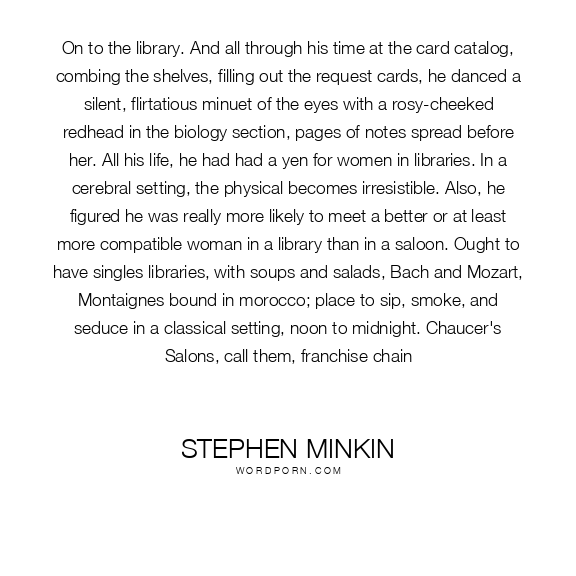 On to the library. And all through his time at the card catalog, combing the shelves, filling out the request cards, he danced a silent, flirtatious minuet of the eyes with a rosy-cheeked redhead in the biology section, pages of notes spread before her. All his life, he had had a yen for women in libraries. In a cerebral setting, the physical becomes irresistible. Also, he figured he was really more likely to meet a better or at least more compatible woman in a library than in a saloon. Ought to have singles libraries, with soups and salads, Bach and Mozart, Montaignes bound in morocco; place to sip, smoke, and seduce in a classical setting, noon to midnight. Chaucer's Salons, call them, franchise chain