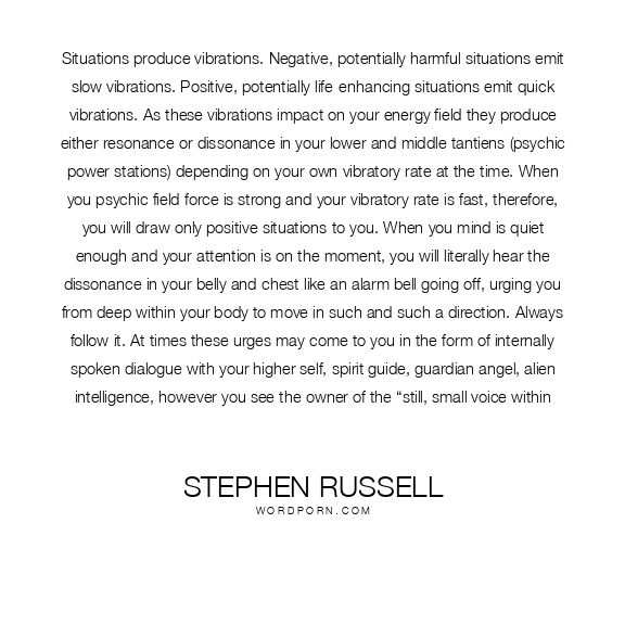 Situations produce vibrations. Negative, potentially harmful situations emit slow vibrations. Positive, potentially life-enhancing situations emit quick vibrations. As these vibrations impact on your energy field they produce either resonance or dissonance in your lower and middle tantiens (psychic power stations) depending on your own vibratory rate at the time. When you psychic field force is strong and your vibratory rate is fast, therefore, you will draw only positive situations to you. When you mind is quiet enough and your attention is on the moment, you will literally hear the dissonance in your belly and chest like an alarm bell going off, urging you from deep within your body to move in such and such a direction. Always follow it. At times these urges may come to you in the form of internally spoken dialogue with your higher self, spirit guide, guardian angel, alien intelligence, however you see the owner of the “still, small voice within