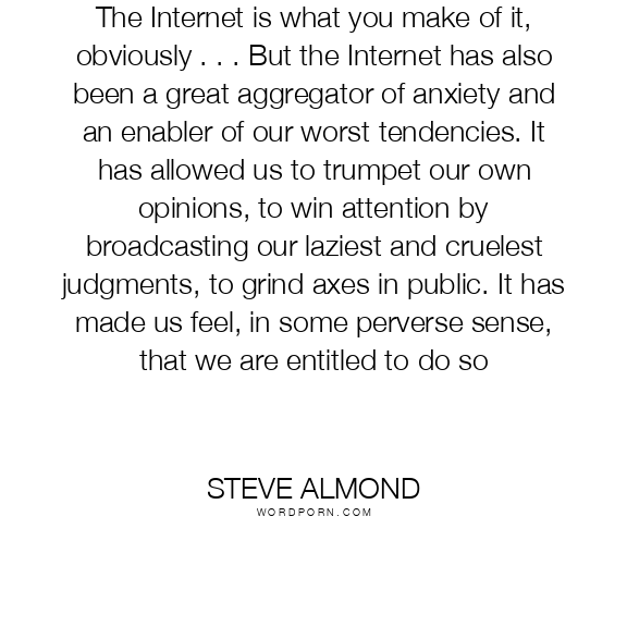 The Internet is what you make of it, obviously . . . But the Internet has also been a great aggregator of anxiety and an enabler of our worst tendencies. It has allowed us to trumpet our own opinions, to win attention by broadcasting our laziest and cruelest judgments, to grind axes in public. It has made us feel, in some perverse sense, that we are entitled to do so