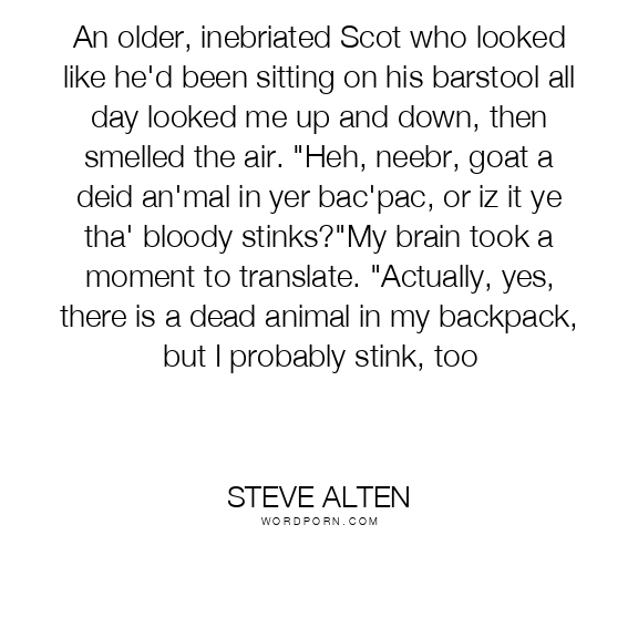 An older, inebriated Scot who looked like he'd been sitting on his barstool all day looked me up and down, then smelled the air. "Heh, neebr, goat a deid an'mal in yer bac'pac, or iz it ye tha' bloody stinks?"My brain took a moment to translate. "Actually, yes, there is a dead animal in my backpack, but I probably stink, too