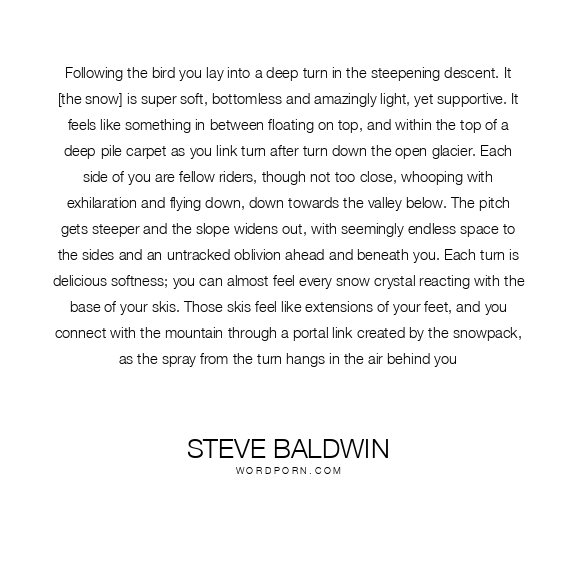 Following the bird you lay into a deep turn in the steepening descent. It [the snow] is super soft, bottomless and amazingly light, yet supportive. It feels like something in between floating on top, and within the top of a deep-pile carpet as you link turn after turn down the open glacier. Each side of you are fellow riders, though not too close, whooping with exhilaration and flying down, down towards the valley below. The pitch gets steeper and the slope widens out, with seemingly endless space to the sides and an untracked oblivion ahead and beneath you. Each turn is delicious softness; you can almost feel every snow crystal reacting with the base of your skis. Those skis feel like extensions of your feet, and you connect with the mountain through a portal link created by the snowpack, as the spray from the turn hangs in the air behind you