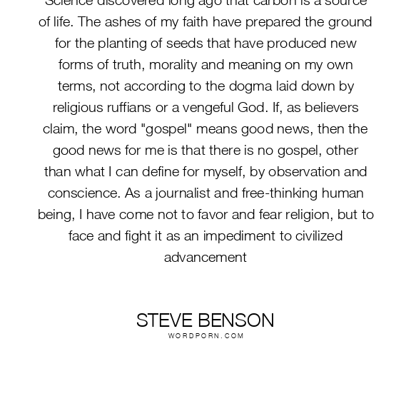 Science discovered long ago that carbon is a source of life. The ashes of my faith have prepared the ground for the planting of seeds that have produced new forms of truth, morality and meaning on my own terms, not according to the dogma laid down by religious ruffians or a vengeful God. If, as believers claim, the word "gospel" means good news, then the good news for me is that there is no gospel, other than what I can define for myself, by observation and conscience. As a journalist and free-thinking human being, I have come not to favor and fear religion, but to face and fight it as an impediment to civilized advancement