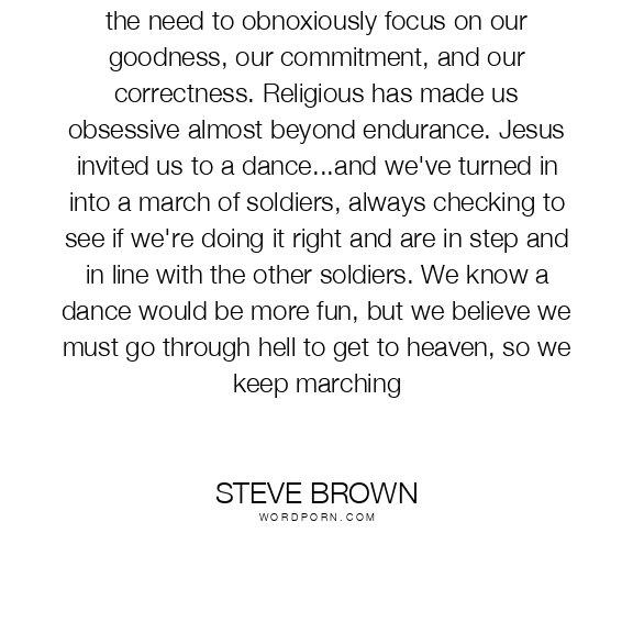The good news is that Christ frees us from the need to obnoxiously focus on our goodness, our commitment, and our correctness. Religious has made us obsessive almost beyond endurance. Jesus invited us to a dance...and we've turned in into a march of soldiers, always checking to see if we're doing it right and are in step and in line with the other soldiers. We know a dance would be more fun, but we believe we must go through hell to get to heaven, so we keep marching