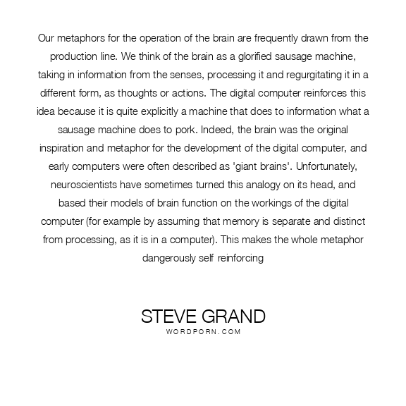 Our metaphors for the operation of the brain are frequently drawn from the production line. We think of the brain as a glorified sausage machine, taking in information from the senses, processing it and regurgitating it in a different form, as thoughts or actions. The digital computer reinforces this idea because it is quite explicitly a machine that does to information what a sausage machine does to pork. Indeed, the brain was the original inspiration and metaphor for the development of the digital computer, and early computers were often described as 'giant brains'. Unfortunately, neuroscientists have sometimes turned this analogy on its head, and based their models of brain function on the workings of the digital computer (for example by assuming that memory is separate and distinct from processing, as it is in a computer). This makes the whole metaphor dangerously self-reinforcing
