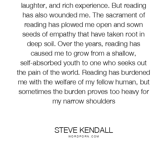 Being a reader has brought me much joy, laughter, and rich experience. But reading has also wounded me. The sacrament of reading has plowed me open and sown seeds of empathy that have taken root in deep soil. Over the years, reading has caused me to grow from a shallow, self-absorbed youth to one who seeks out the pain of the world. Reading has burdened me with the welfare of my fellow human, but sometimes the burden proves too heavy for my narrow shoulders