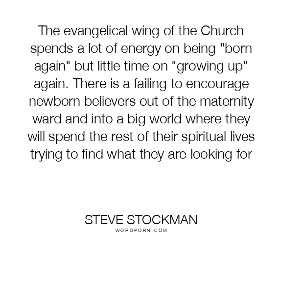 The evangelical wing of the Church spends a lot of energy on being "born again" but little time on "growing up" again. There is a failing to encourage newborn believers out of the maternity ward and into a big world where they will spend the rest of their spiritual lives trying to find what they are looking for