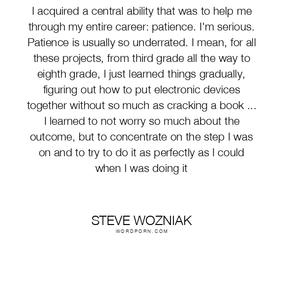 I acquired a central ability that was to help me through my entire career: patience. I'm serious. Patience is usually so underrated. I mean, for all these projects, from third grade all the way to eighth grade, I just learned things gradually, figuring out how to put electronic devices together without so much as cracking a book ... I learned to not worry so much about the outcome, but to concentrate on the step I was on and to try to do it as perfectly as I could when I was doing it