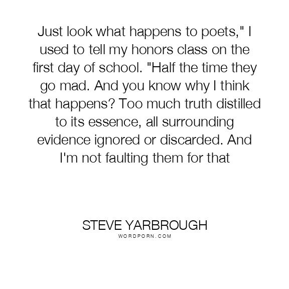 Just look what happens to poets," I used to tell my honors class on the first day of school. "Half the time they go mad. And you know why I think that happens? Too much truth distilled to its essence, all surrounding evidence ignored or discarded. And I'm not faulting them for that