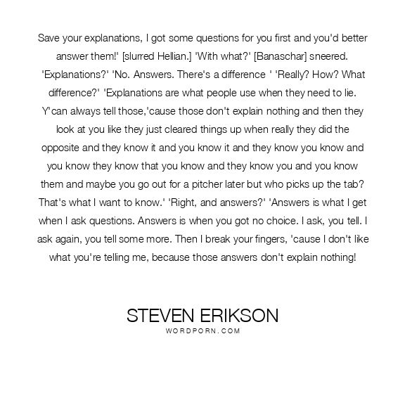 Save your explanations, I got some questions for you first and you'd better answer them!' [slurred Hellian.] 'With what?' [Banaschar] sneered. 'Explanations?' 'No. Answers. There's a difference-' 'Really? How? What difference?' 'Explanations are what people use when they need to lie. Y'can always tell those,'cause those don't explain nothing and then they look at you like they just cleared things up when really they did the opposite and they know it and you know it and they know you know and you know they know that you know and they know you and you know them and maybe you go out for a pitcher later but who picks up the tab? That's what I want to know.' 'Right, and answers?' 'Answers is what I get when I ask questions. Answers is when you got no choice. I ask, you tell. I ask again, you tell some more. Then I break your fingers, 'cause I don't like what you're telling me, because those answers don't explain nothing!