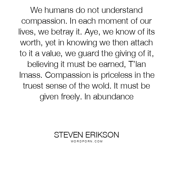 We humans do not understand compassion. In each moment of our lives, we betray it. Aye, we know of its worth, yet in knowing we then attach to it a value, we guard the giving of it, believing it must be earned, T’lan Imass. Compassion is priceless in the truest sense of the wold. It must be given freely. In abundance