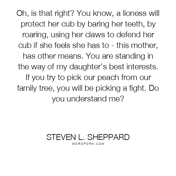 Oh, is that right? You know, a lioness will protect her cub by baring her teeth, by roaring, using her claws to defend her cub if she feels she has to - this mother, has other means. You are standing in the way of my daughter's best interests. If you try to pick our peach from our family tree, you will be picking a fight. Do you understand me?