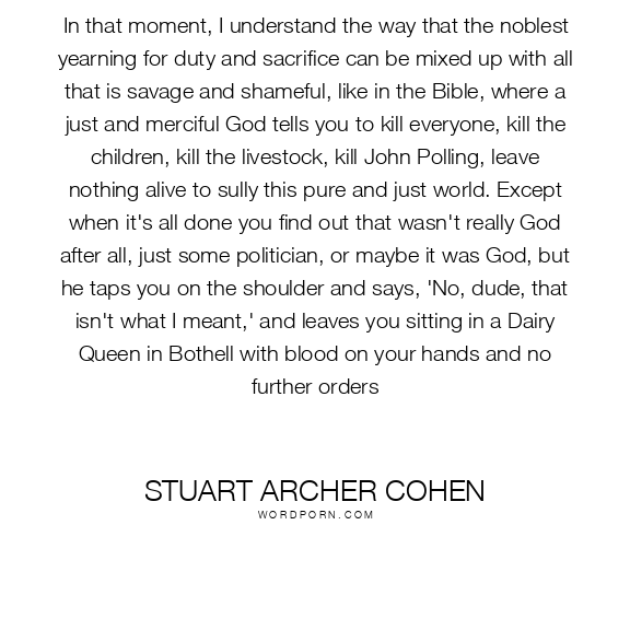 In that moment, I understand the way that the noblest yearning for duty and sacrifice can be mixed up with all that is savage and shameful, like in the Bible, where a just and merciful God tells you to kill everyone, kill the children, kill the livestock, kill John Polling, leave nothing alive to sully this pure and just world. Except when it's all done you find out that wasn't really God after all, just some politician, or maybe it was God, but he taps you on the shoulder and says, 'No, dude, that isn't what I meant,' and leaves you sitting in a Dairy Queen in Bothell with blood on your hands and no further orders
