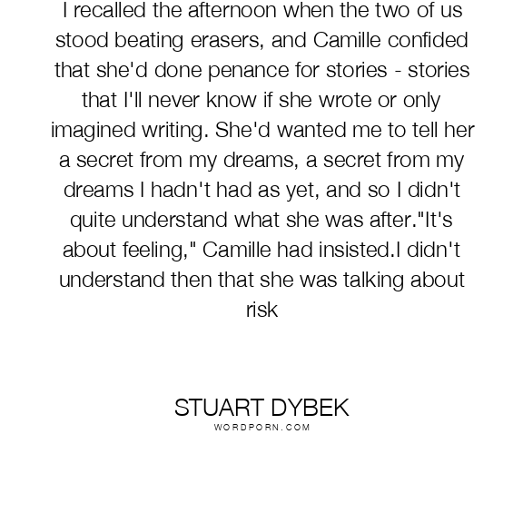 I recalled the afternoon when the two of us stood beating erasers, and Camille confided that she'd done penance for stories - stories that I'll never know if she wrote or only imagined writing. She'd wanted me to tell her a secret from my dreams, a secret from my dreams I hadn't had as yet, and so I didn't quite understand what she was after."It's about feeling," Camille had insisted.I didn't understand then that she was talking about risk
