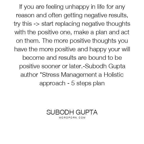 If you are feeling unhappy in life for any reason and often getting negative results, try this -> start replacing negative thoughts with the positive one, make a plan and act on them. The more positive thoughts you have the more positive and happy your will become and results are bound to be positive sooner or later.-Subodh Gupta author "Stress Management a Holistic approach - 5 steps plan