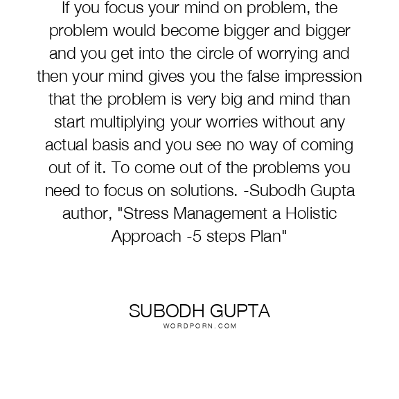 If you focus your mind on problem, the problem would become bigger and bigger and you get into the circle of worrying and then your mind gives you the false impression that the problem is very big and mind than start multiplying your worries without any actual basis and you see no way of coming out of it. To come out of the problems you need to focus on solutions. -Subodh Gupta author, "Stress Management a Holistic Approach -5 steps Plan"