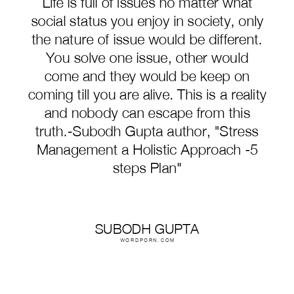 Life is full of issues no matter what social status you enjoy in society, only the nature of issue would be different. You solve one issue, other would come and they would be keep on coming till you are alive. This is a reality and nobody can escape from this truth.-Subodh Gupta author, "Stress Management a Holistic Approach -5 steps Plan"