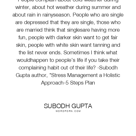 People complain about cold weather during winter, about hot weather during summer and about rain in rainyseason. People who are single are depressed that they are single, those who are married think that singlesare having more fun, people with darker skin want to get fair skin, people with white skin want tanning and the list never ends. Sometimes I think what wouldhappen to people’s life if you take their complaining habit out of their life? -Subodh Gupta author, "Stress Management a Holistic Approach-5 Steps Plan